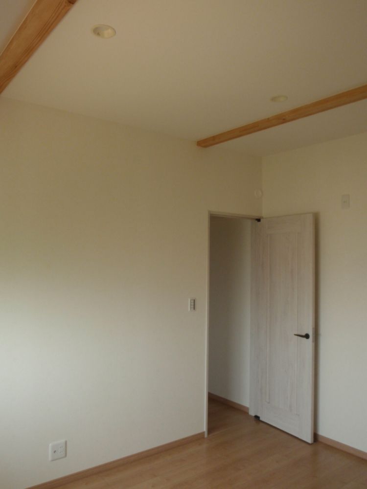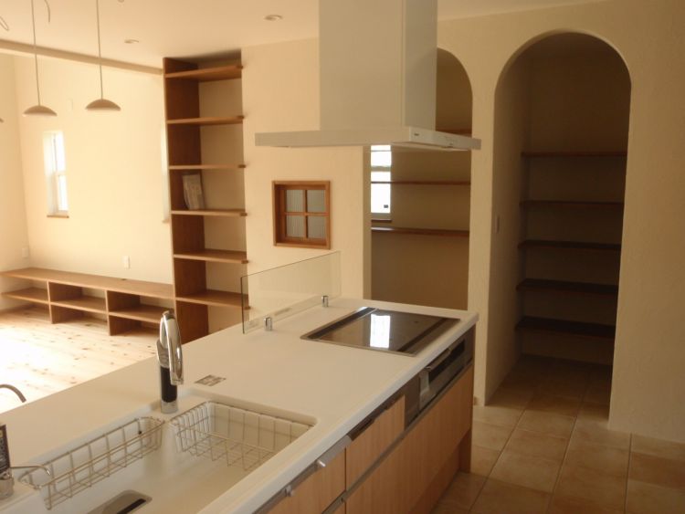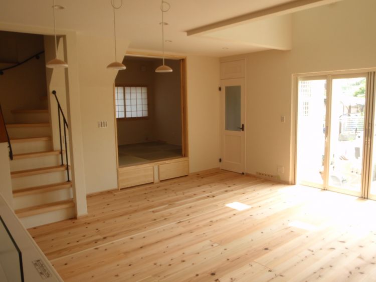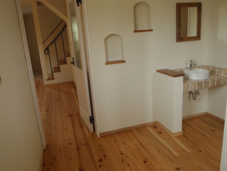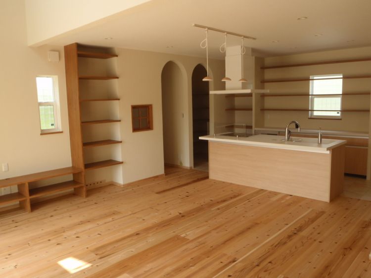 フローリングは杉の無垢材を使用し、内装は珪藻土を塗っています! 棚や窓枠など室内に多くの木を使用したので、木の温かみが感じられる、いい雰囲気の家に仕上がりました 外壁は無塗装のサイディングの上に塗料をコテ塗りしています 家のスペックは通気断熱WB工法を採用していますので、断熱性能がよく、アレルギー等が気になる方には安心な家になっています