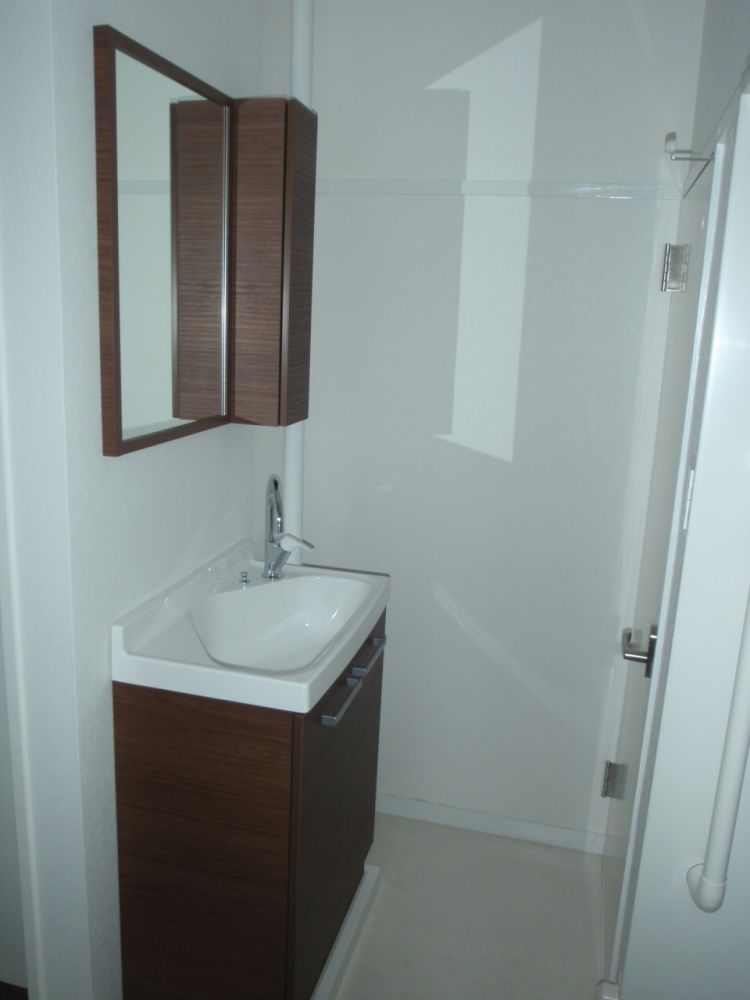 洗面化粧台の中に電気温水器を設置したので、ちゃんとお湯も出ますよ!